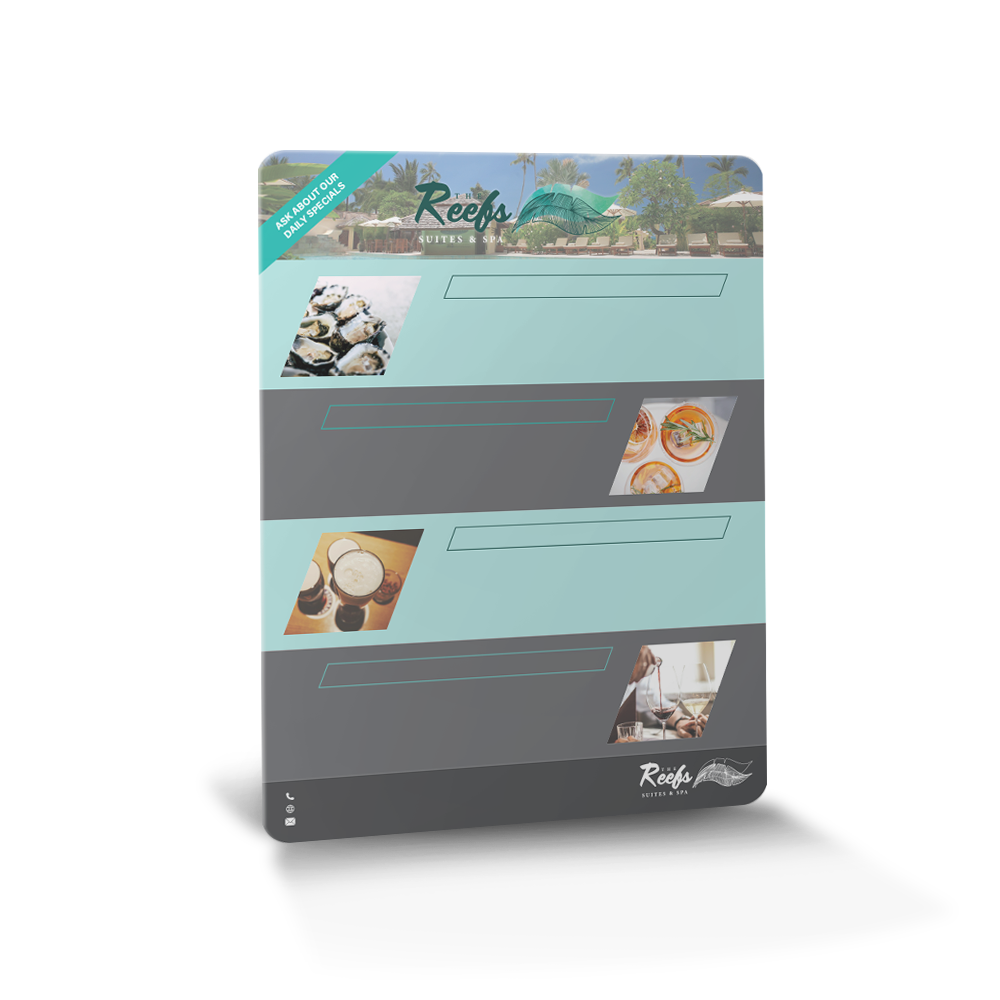 Sit back and relax with with these pre-designed menus. Customize the text on these menus to fit what your establishment offers. The waterproof material makes them perfect for the pool side bar!